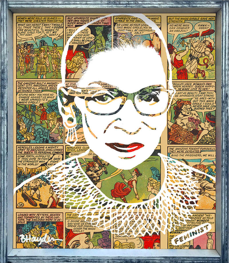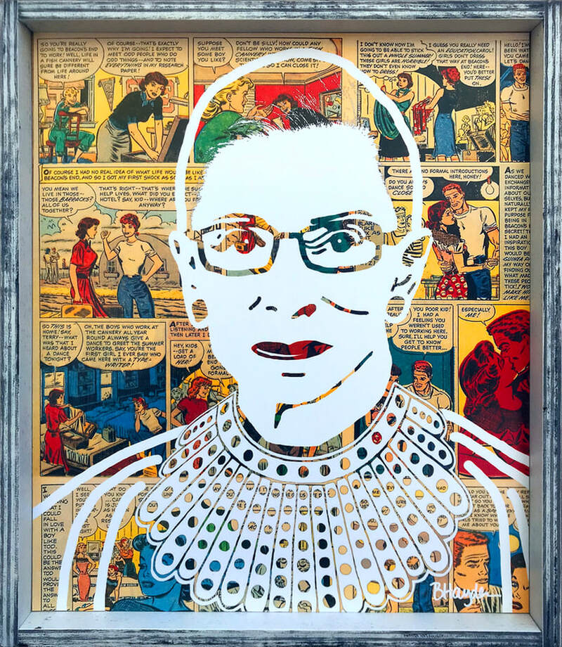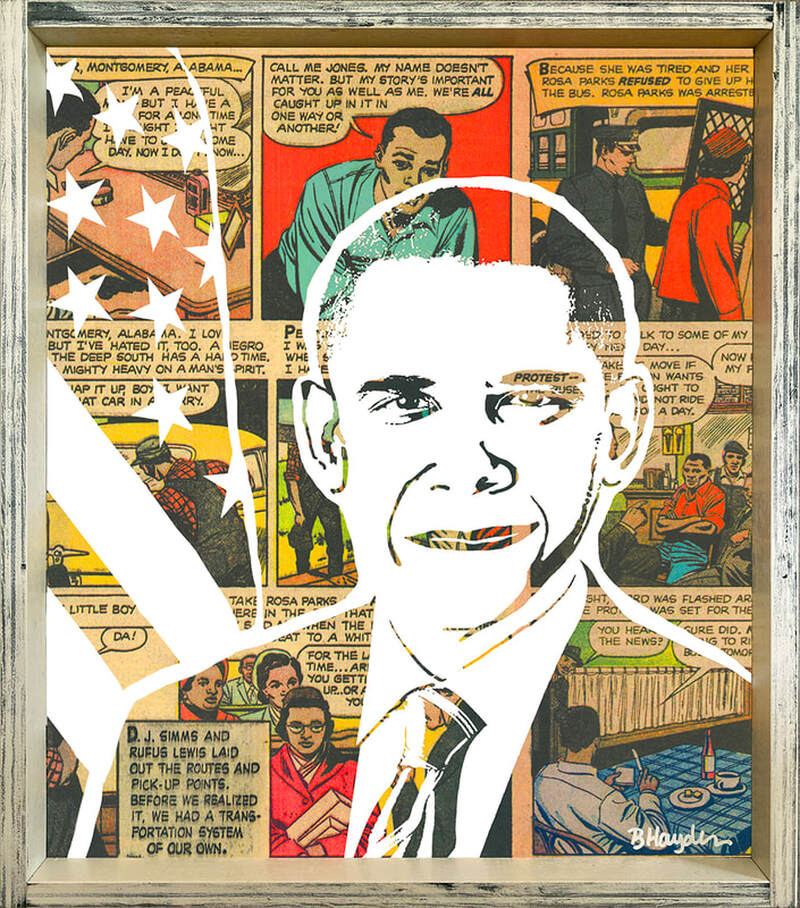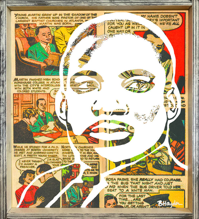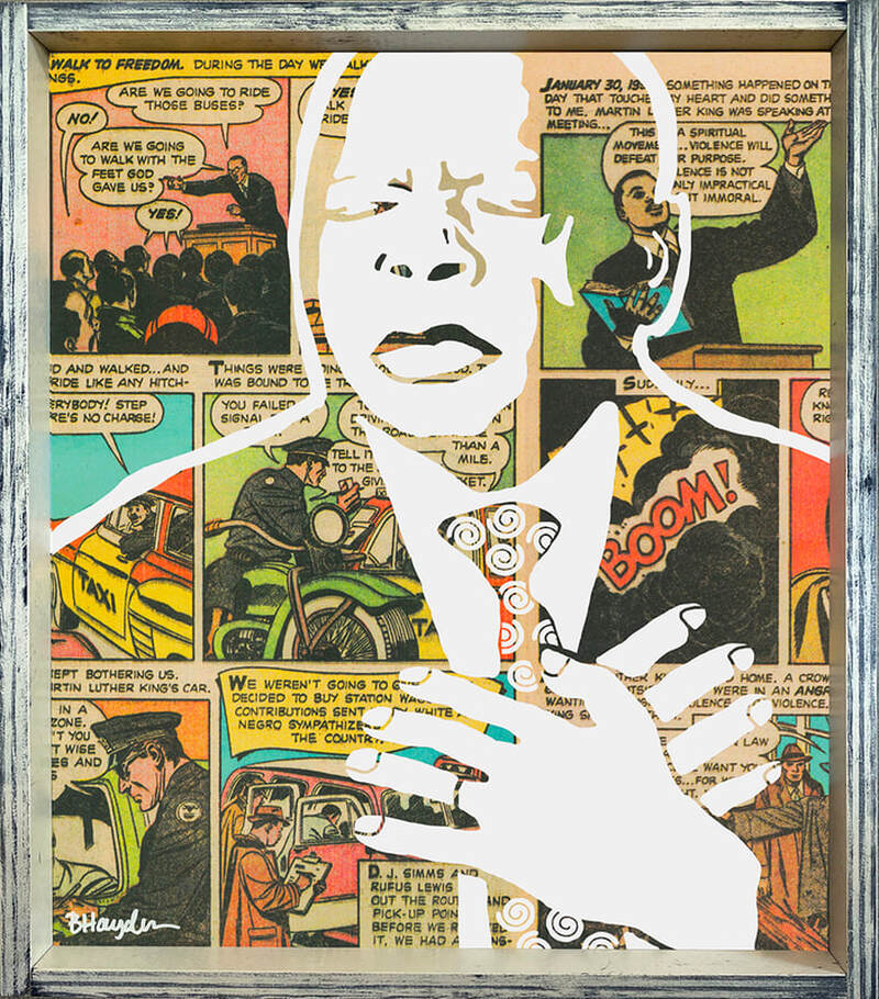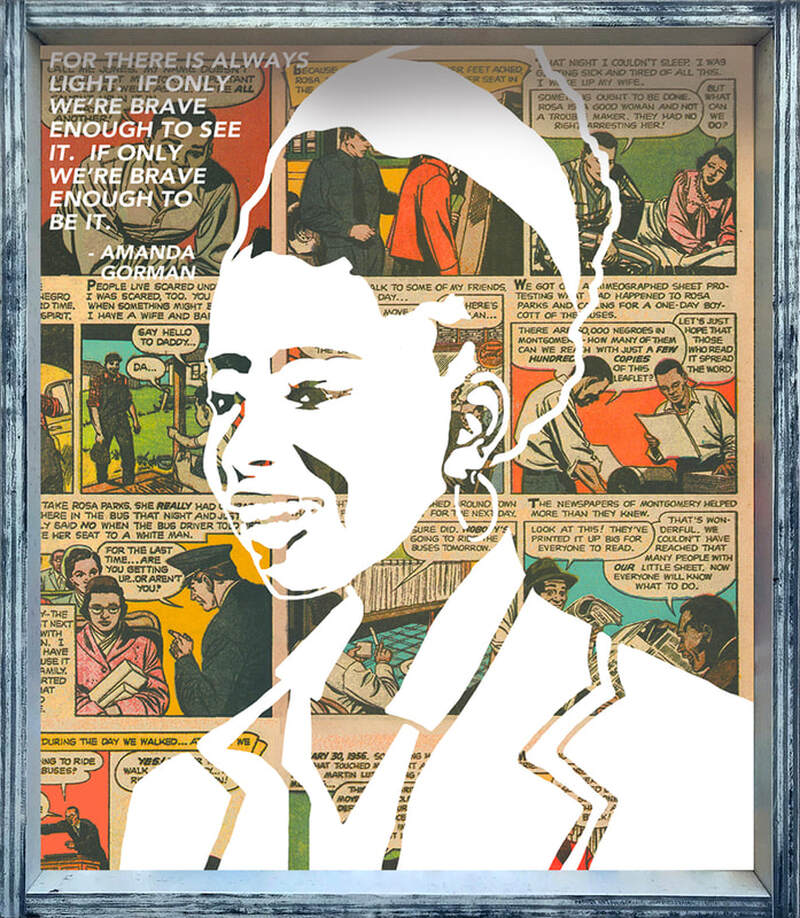 These new pieces are a special extension of my original comics series.  I call this new group Heroes.  Where the background for the previous comics pieces were romance comics from the 1960s,  the background for these is a 1957 comic book entitled Martin Luther King and the Montgomery Story.  This particular comic is credited with inspiring many to take on non-violent protest as a means to achieving civil rights for all with its story of the Montgomery Bus Boycott.  Stories have been told of  many activists taking a copy of this comic with them to lunch counter sit ins.  John Lewis was reported to be a big fan so it seemed like it would be a very fitting background for these portraits.  I look forward to creating more Heroes portraits to add to this series.
