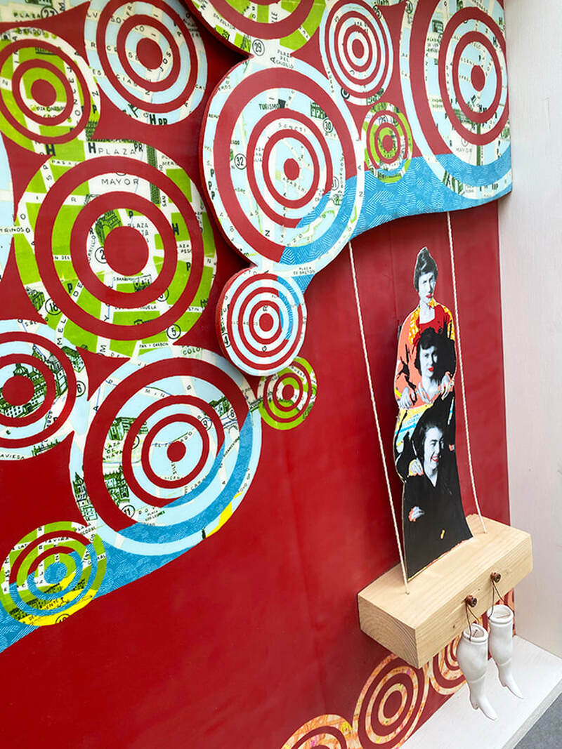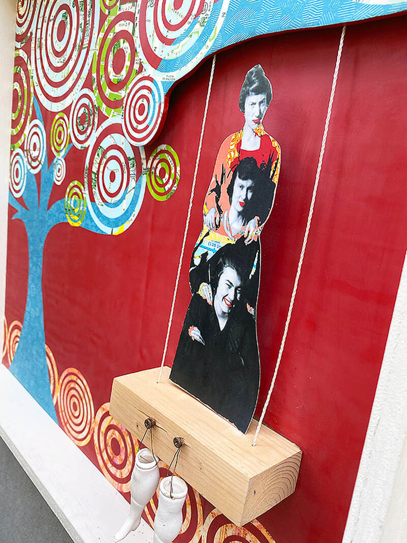 - Mixed media: wood, acrylic paint, paper, vintage ephemera, twine, porcelain doll legs, encaustic beeswax